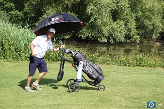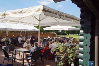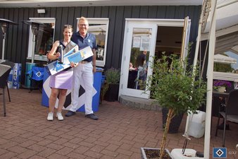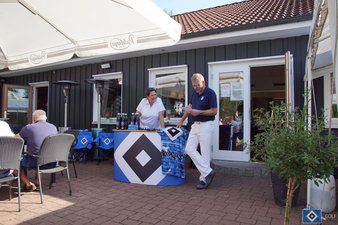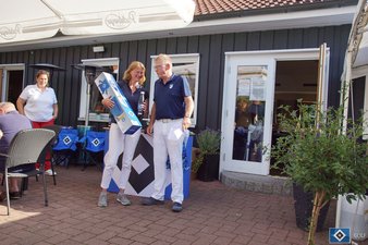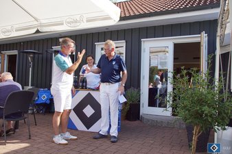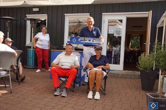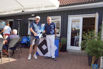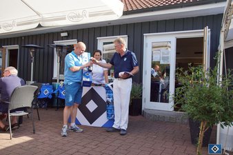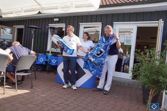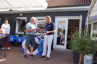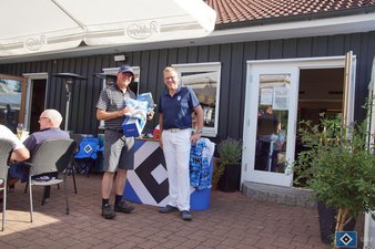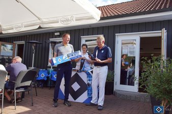 Nach gut 4 Stunden trafen die ersten gut gebräunten oder geröteten Spieler ein, um auf der Terasse Kaltgetränke zu geniessen. Während nach und nach alle Teilnehmer eintrafen, versorgte das sehr gut organisierte und engagierte Gastroteam vom GCGH alle flightweise mit den vorbestellten Essen. Hinter den Kulissen duschte der mitspielende HSV Golf-Club Vorsitzende flugs, um sogleich mit Ute, Iris und Julia Mertins vom GCGH die Turnierauswertung zu starten und die Siegerehrung vorzubereiten. Kaum waren alle Flights zurück, begrüssten Iris und Kurt alle Teilnehmer noch einmal und bedankten sich bei allen Helfern und unseren Sponsoren, Vilsa, Castan-Golf und die netzkraefte. Danach begann die sehr grosszügige Preisverleihung. Nahezu jeder Gewinner wurde mit einem tollen HSV-Campingstuhl oder Handtuch und diversen weiteren Preisen bedacht, welche auch in der Bildergalerie bestaunt werden können.