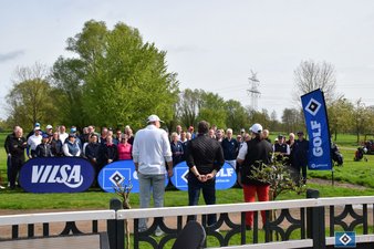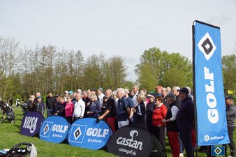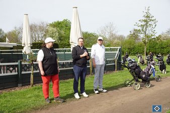 Frauke, Kurt und Timo sorgten mit freundlicher Begrüßung und Erklärung zu den Regeln des Chapman-Vierer-Formats dafür, dass es losgehen konnte. Nach dem obligatorischen Gruppenfoto verteilten sich die Grüppchen auf die Starttees. Um Punkt 11:00 Uhr "pfiffen" Ute und Holger das Turnier per Tröte an.