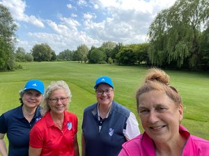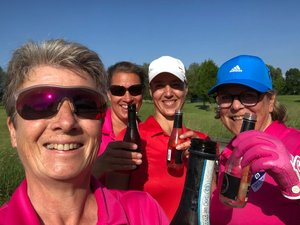 Dann Start um 14.40 Uhr, Modus natürlich Zählspiel. Konzentration war gefragt, denn es galt das Trauma „Ergebnis Damen-Mannschaftspokal“ wettzumachen. Frauke ist es wohl am besten gelungen, sie kam nach fast fünf gespielten Stunden (schon an Loch 6 liefen wir auf den 2er-Vorflight auf) als Siegerin von uns acht Spielerinnen mit 89 Schlägen ins Ziel. Es folgten Kerstin, Christina und Iris mit deutlich unter 100. Die restlichen Ergebnisse waren okay, sogar klasse, wenn man nur die ersten Neun betrachtet: Iris kam auf exzellente 44 Schläge. Und auch Christine brauchte nur zwei Schläge mehr. Und dann wollen wir auch die fünf gespielten Birdies erwähnen. Die Spielleitung hat anscheinend mit weniger gerechnet, denn plötzlich gingen die Preise aus. Auf jeden Fall werden wir die Zeit bis zum Spieltag im August nutzen, um bis dahin die notwendige Konstanz weiter aufzubauen.