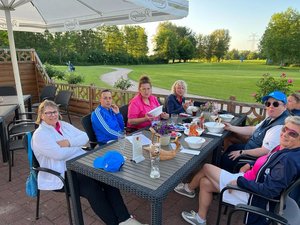 Nachdem wir uns schon eine Stunde vor dem Abschlag auf der Club-Terrasse bei einer Tasse Kaffee oder einem kühlen Drink (das Essen für nach der Runde vorzubestellen wäre nicht schlecht gewesen, wussten wir zu diesem Zeitpunkt aber leider noch nicht) getroffen haben, nutzten wir die Zeit und planten den letzten Spieltag ebendort.