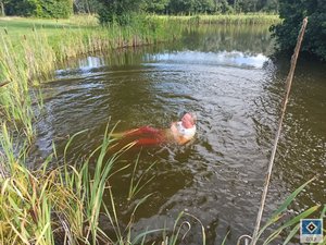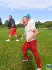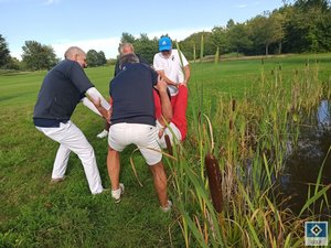 Weiterhin wurde verkündet, dass Thomas Voß sich mit seinen 75 Schlägen erstmalig das neue Handicap 9,2 erspielt hat. Sofort hieß es von allen Seiten: Ab in den Teich! Von zahlreichen Mannschaftsspielern begleitet wurde er an den Teich an der 18. geführt, an Armen und Beinen gepackt und unter lautem Gejohle in großem Bogen in den Teich geworfen.