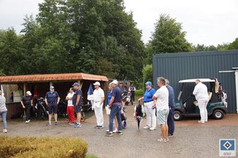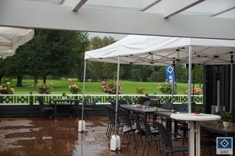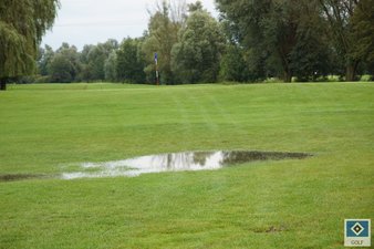 Der sprichwörtliche Wermutstropfen erreichte den Platz gegen 14:00 Uhr. Ein schnell heraufziehendes Gewitter zwang die Spielleitung zur Unterbrechung. Es war gerade noch genug Zeit einen trockenen Unterstand zu finden, bevor der Regen kurz und sehr heftig niederging. Es bildeten sich Wasserlachen auf dem Platz und den Grüns, wie man sie selten sieht. Glück im Unglück, nach rund einer Stunde konnte das Turnier fortgesetzt werden.