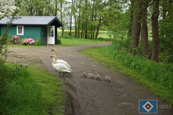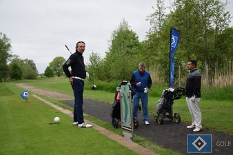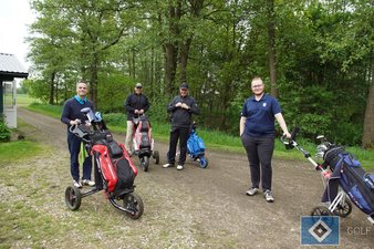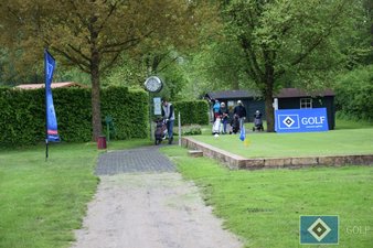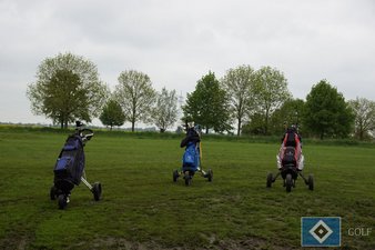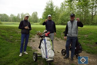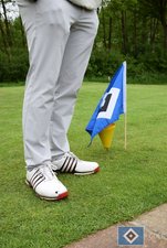 Das Wetter sollte uns aber auch am Turniertag weiter beschäftigten. Angesagt waren Sonnenschein und bis zu 20 Grad. Um 7:00 Uhr zum Aufbau empfingen uns bedeckter Himmel und knappe 8 Grad, im Wind gefühlt 0 Grad. Bibber. Die erste Platzinspektion beim Aufstellen der Fahnen und Banner zeigte uns die verheerende Wirkung des vielen Regens der letzten Tage. Langes Gras und darunter aufgeweichte Böden. Mähen nahezu unmöglich. Daher wurde das Turnier auf nicht Handicap relevant zurückgestuft, Regeln für Besserlegen beschlossen.