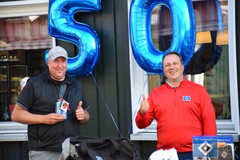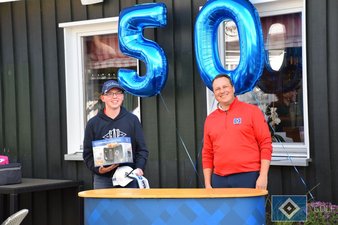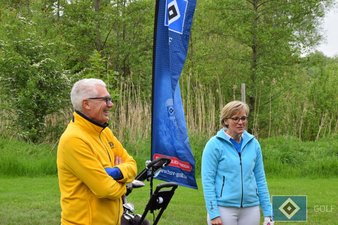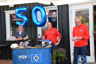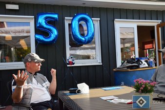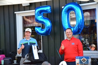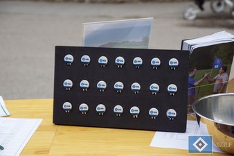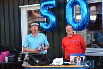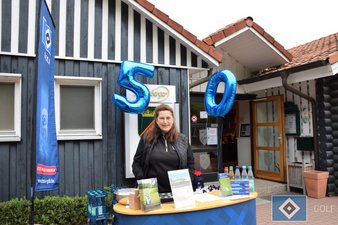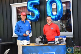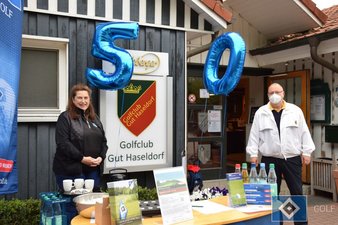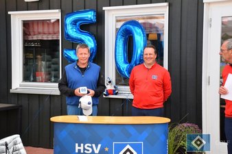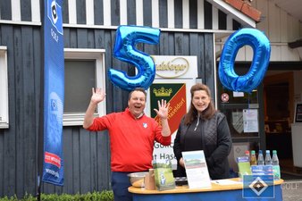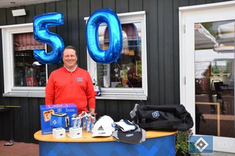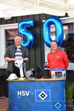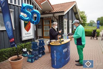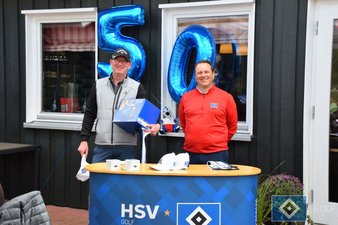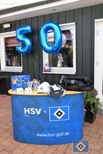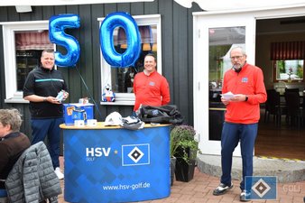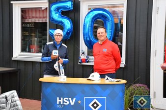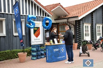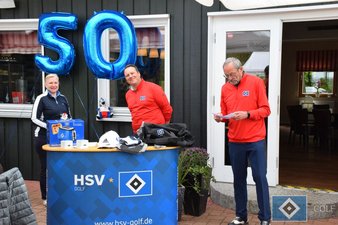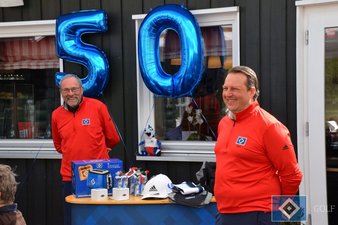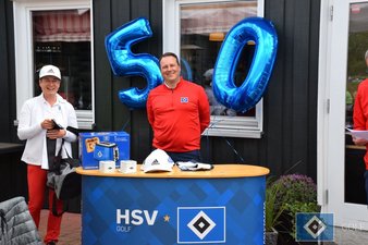 Trotz trüber Aussichten empfingen Iris und Ute die Teilnehmer*innen gut gelaunt am Clubhaus und teilten die Teegeschenke aus. Dabei wurden sie von zwei großen Luftballons eingerahmt, die unübersehbar zeigten, was es heute zu feiern gab. Neben einem leckeren Getränk von unserem Partner Vilsa Brunnen und HSV-Tees gab es für alle Spieler*innen das erste Highlight mitzunehmen: Einen besonderen Ballmarker mit dem Logo 50. HSV-GOLF Open nebst Hat-Clip.