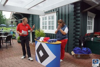 Zum Start der Siegerehrung wurde das Hole in One von Simone K.-J. gefeiert und mit einem Schnäpschen begossen. Als Preis vom HSV wurde Simone K. ein Greenfeegutschein für die Einspielrunde zur 61. HSV-Open in GC Waldhof überreicht.