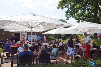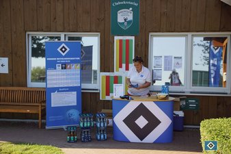 Die Siegerehrung in praller Sonne zwischen Range und Terrasse, auf welcher alle Lecker Grillgut und vornehmlich kühle Getränke genossen. Statt Wärmedecken gab es dieses Mal passend zur Jahreszeit Badehandtücher, die beliebten HSV-Mützen und viele andere Preise.