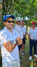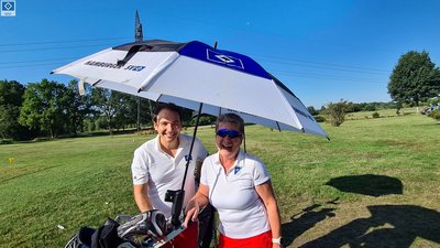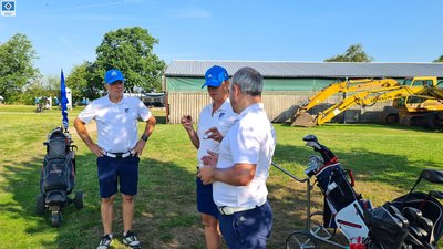 Am Sonntag standen uns zwei Spieler weniger zur Verfügung, so dass 6 Spieler jeweils zwei Mal über 18 Loch gehen mussten, wenn die Partien nicht vorher entschieden waren. Start für die Einzel war ab 14 Uhr bei Tagesspitzentemperaturen. Bei jenseits der 30 Grad und meist stechender Sonne halfen Regen-/Sonnenschirme und die gute Versorgung mit Getränkenachschub (Dank an unseren Sponsor Vilsa) vor- und auf der Runde. Wo möglich, wurde Schatten gesucht, z.B. beim gemeinschaftlichen Warten auf die jeweiligen ersten Abschläge der Clubkameraden an der 1.